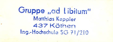 ad libitum (lat. = nach Belieben) wurde 1971 als Studentenband an der Ingenieur- hochschule Köthen gegründet. In der Erstbesetzung musizierten mit Matthias Keppler (git) als Bandleader, Peter Raasch (voc, fl, perc), Detlef Zappe (bg), Reiner Schottstedt (org), kurzzeitig in der Gründungsphase Siggi Queck (2. git) und Axel Stuwe (dr). Das Repertoire war auf tanzbare, melodische Rockmusik ausgerichtet. Zur Titelauswahl gehörten Stücke von Uriah Heep, CCR, Deep Purple, Santana, Czeslaw Niemen (Enigmatic Impressions), Exeption, Jethro Tull oder Frumpy (How the gipsy was born). Eigene Kompositionen gab es nicht. Hierfür fehlte neben dem Studium einfach die nötige Zeit. 1972 wurde das Schlagzeug durch den Köthener Privatunternehmer Roland Hahn und der Bass 1973 mit Dietmar (Vinzens) Pontow neu besetzt. Zeitweise fungierte der an der IHS Köthen angestellte wissenschaftliche Mitarbeiter Stephan Paarmann (später Gruppe Set Köthen) aus Biendorf als musikalischer Berater und Horst-Peter Lämmler, bekannt unter "Ryngo", als Moderator. ad libitum hatte zahlreiche Auftritte, die über den Großraum Halle-Leipzig bis nach Berlin führten. Einer der Höhepunkte im Bandschaffen war die Teilnahme an den X. Weltfestspielen der Jugend und Studenten 1973 in Ost-Berlin. ad libitum spielte u.a. auf dem Alexanderplatz vor tausenden begeisterten Besuchern. Mit Ende des Studiums an der IHS 1975 löste sich "ad libitum Köthen" auf. In der Folgezeit gingen Peter Raasch, Roland Hahn und Reiner Schottstedt bis etwa 1977/78 zu Set Köthen.
